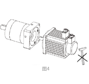取走電機(jī)軸鍵(PX142 以上減速機(jī)為帶鍵聯(lián)接),將電機(jī)輸出軸、定位凸臺(tái)及減速機(jī)連接部位的防銹油用汽油或鋅鈉水擦拭凈(圖 3),其目的是保證連接的緊密性及運(yùn)轉(zhuǎn)的靈活性,并且防止不必要的磨損,將電機(jī)與減速機(jī)自然連接。連接時(shí)必須保證減速機(jī)輸出軸與電機(jī)輸入軸同軸度一致,且二者外側(cè)法蘭平行,如果軸度不一致,會(huì)導(dǎo)致電機(jī)軸折斷或減速機(jī)齒輪磨損。另外,在安裝時(shí),嚴(yán)禁用鐵錘等擊打,防止軸向力或徑向力過(guò)大損壞軸承或齒輪(圖 4)。
